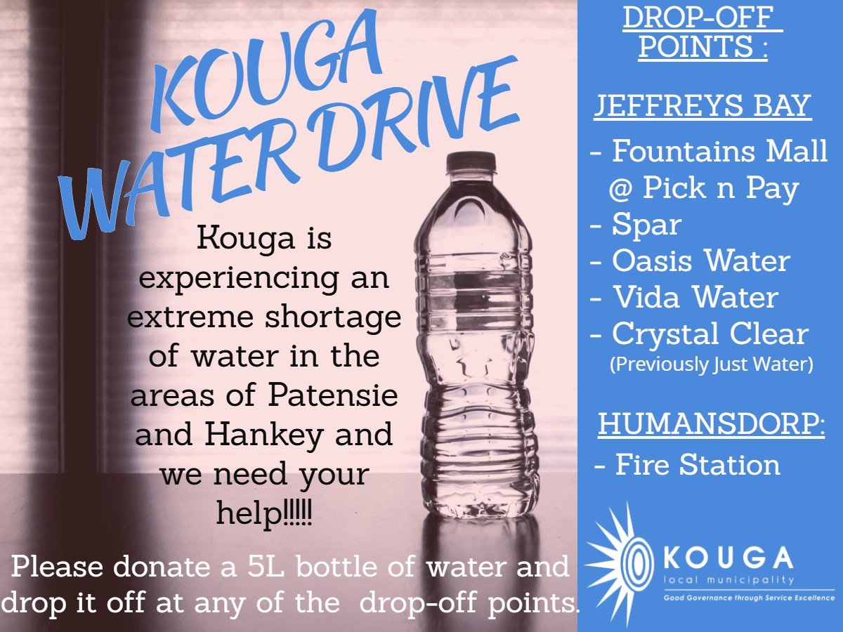 Plea for assistance for donations of water for residents of Patensie and Hankey in @KougaMuni Water is Life. Every drop counts.pic.twitter.com/X5O39TdNDo