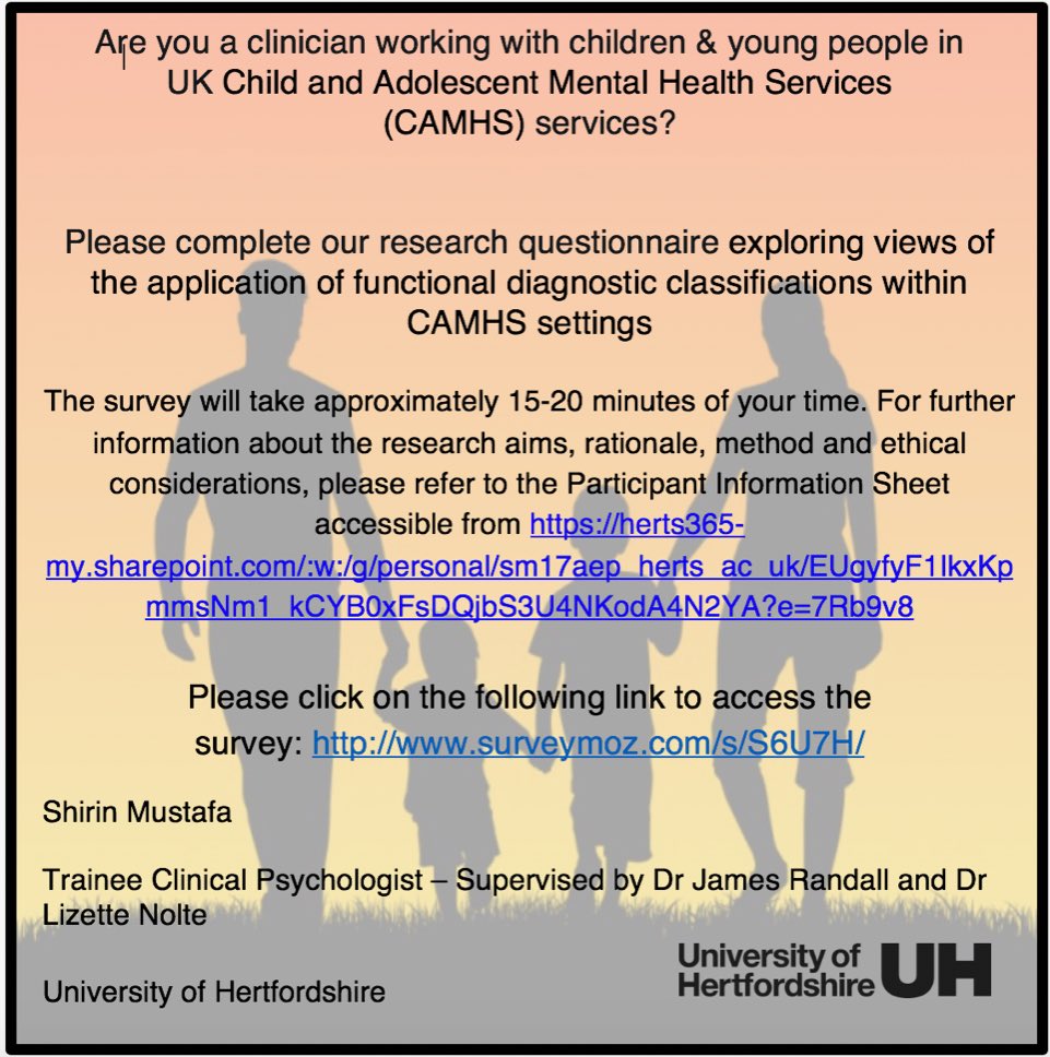 A survey exploring use of & practices in relation to psychiatric diagnoses within CAMHS & young people’s #mentalhealth services@DclinpsyUh@UniofHerts#DClinPsy’s@ShirinAMustafa is curious to extend our previous studies in AMH http://www.surveymoz.com/s/S6U7H/ pic.twitter.com/eML6afTd6x