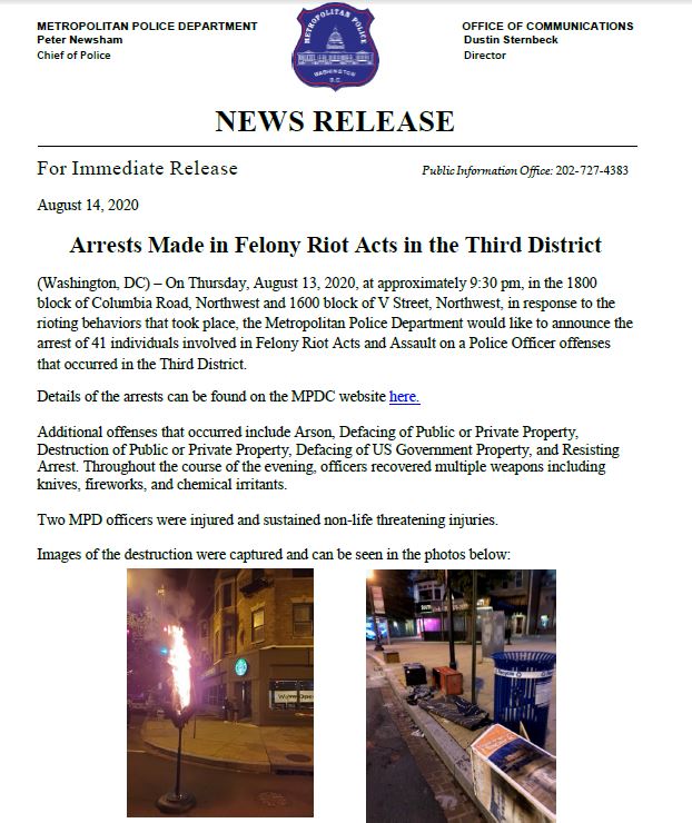 MPD announces arrests have been made in Felony Rioting & Assault on Police Officer offenses that occurred overnight. Arrest info: https://mpdc.dc.gov/page/may-august-2020-unrest-related-arrests-and-persons-interest … Release: https://mpdc.dc.gov/release/arrests-made-felony-riot-acts-third-district …pic.twitter.com/YXTpHAUSsS