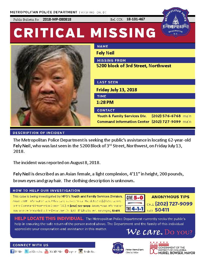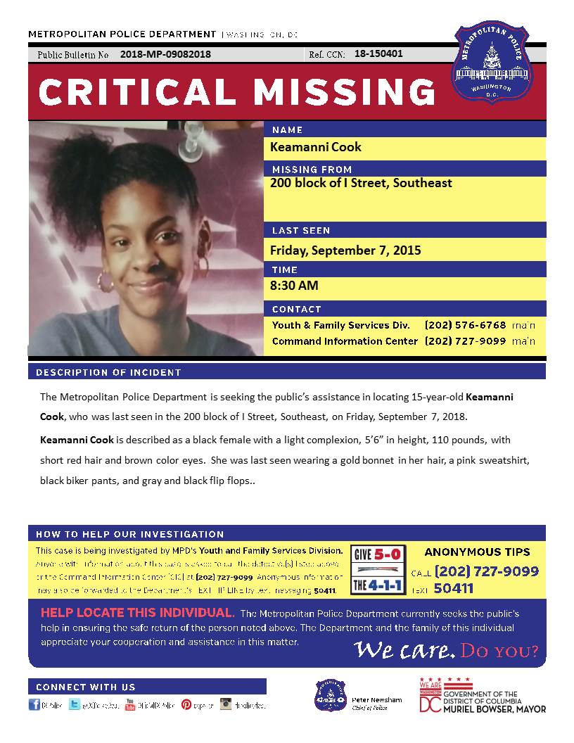 If anyone has any information about her disappearance, we encourage you to please call (202) 727-9099/text 50411.