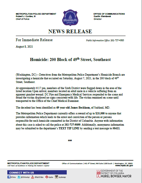 MPD seeks the public's assistance in a Homicide offense that occurred on 8/7/2021 in the 200 blk of 49th Street, SE Have info? Call (202) 727-9099/text 50411 Release: https://bit.ly/2VtBUok pic.twitter.com/mXHWwP4EFR