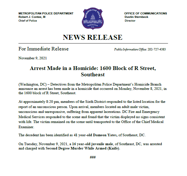 MPD announces an arrest has been made in reference to a Homicide offense that occurred on Saturday, August 7, 2021, in the 3000 block of Nelson Street, Southeast. Release: https://bit.ly/37tD8lK pic.twitter.com/G62kfO24vd