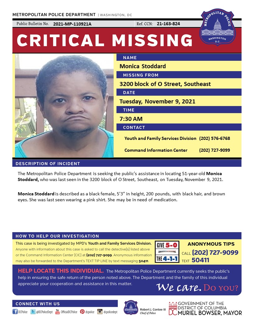 #MissingPerson 50 year-old Theresa Harris-Hines, who was last seen in the 1600 block of 17th Street, Northwest, on August 2, 2021. Have info? Call (202) 727-9099/text 50411pic.twitter.com/pOpEPHAsAz