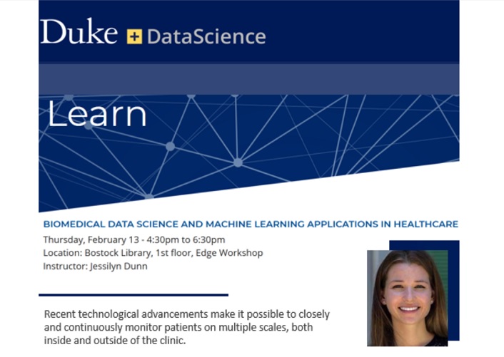 @DukeU's +DataScience learning opportunity with DCRI's@drjessilyn on Biomedical#DataScience &#MachineLearning Applications in#Healthcare | For more info and to register: http://bit.ly/2NOCkhM pic.twitter.com/gFa4QLiPEf