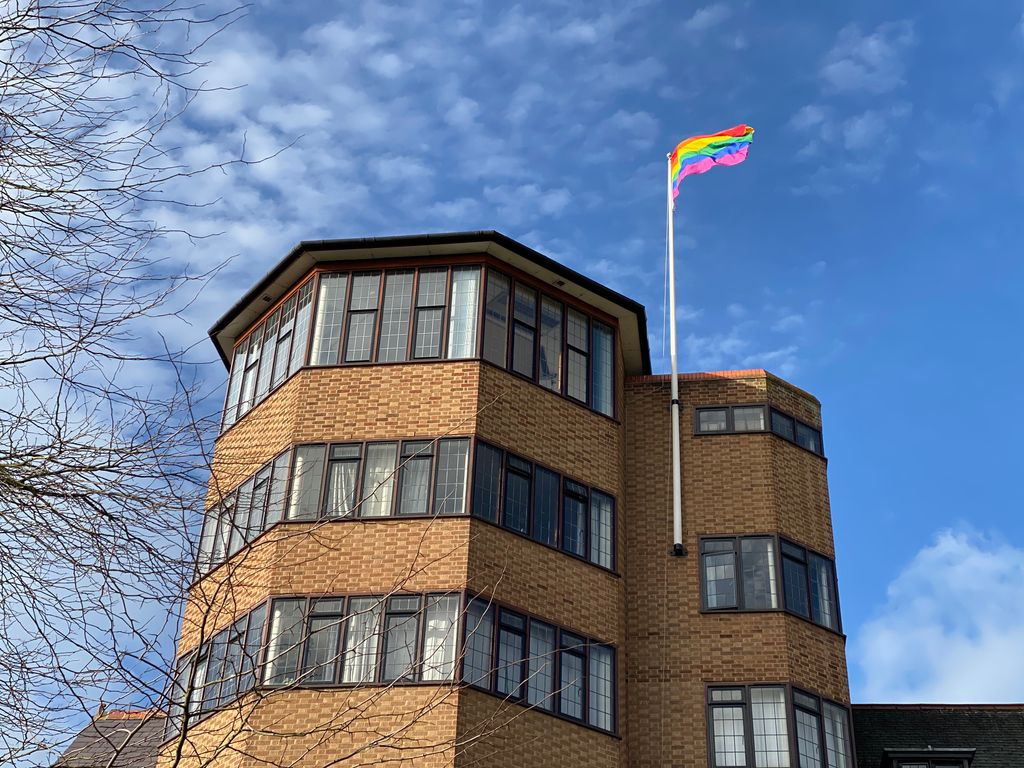 Flying the rainbow flag above St Edmund's to mark the start of LGBT+ History Month
