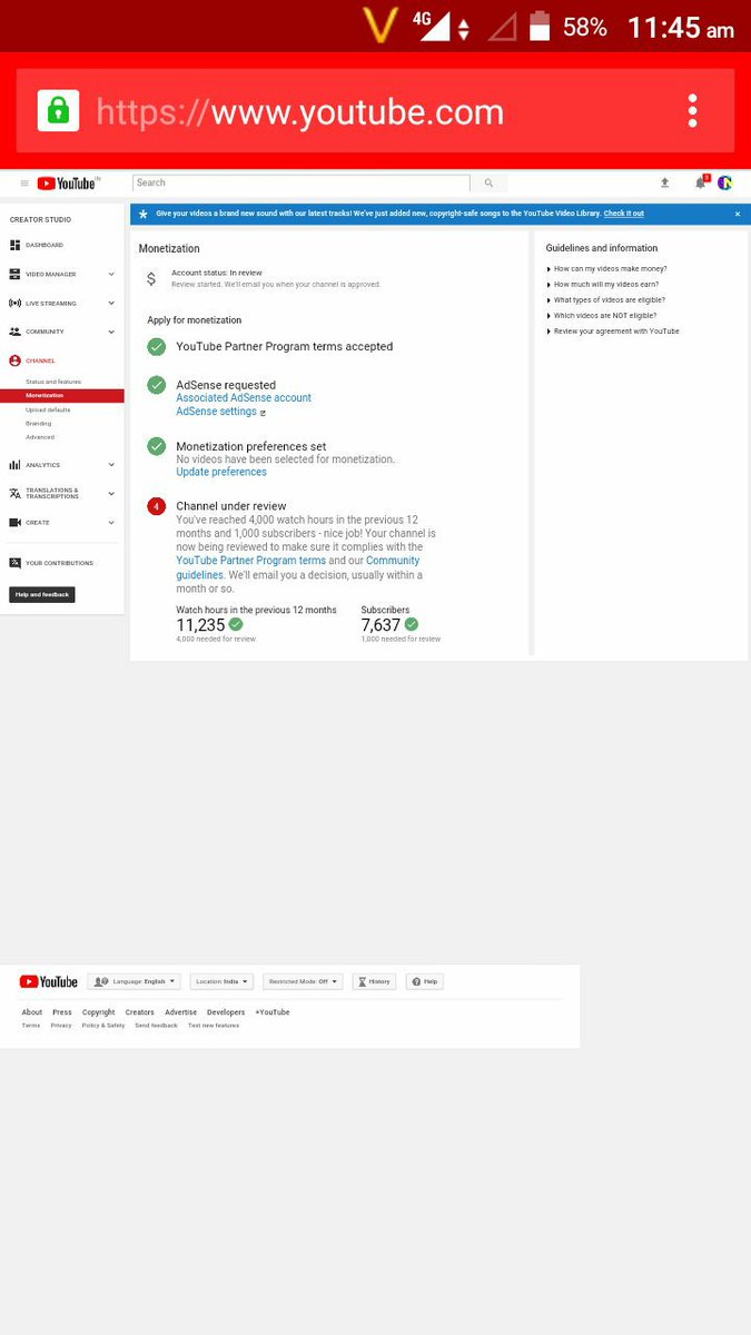Hello @TeamYouTube My channel is completed the 4K+ hours watch time & 1K+ subscribers in previous 365 days and still my channel monetization is not enabled plz guide us. Channel Name(DESI NEWS)Channel link:https://www.youtube.com/channel/UCslD7J-wwV4_ChJBo6UcDfg?app=desktop ….. Thank you. PLEASE REPLY TEAM YOUTUBEpic.twitter.com/ROi8b9gXwf