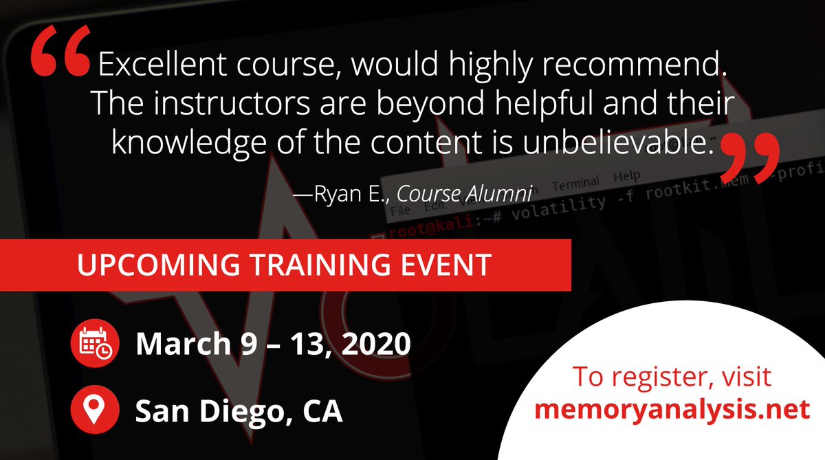 @volatility Malware and Memory Forensics training course is coming up March 9-13 in San Diego! There are a few spots left so register now! See the 2020 Training Schedule and more details here: https://volatility-labs.blogspot.com/2019/10/volatility-malware-and-memory-forensics-training.html …#dfir#infosec#memoryforensicspic.twitter.com/rQXrzg08Sx