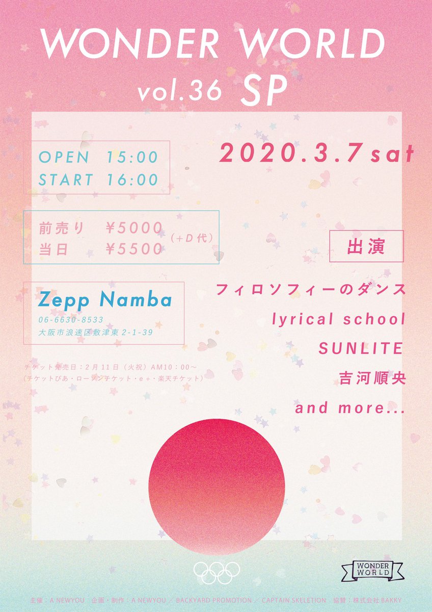【情報解禁】 2020年3月7日(土) 「WONDER WORLD vol. 36 SP」 会場:Zepp Namba OPEN 15:00/START 16:00 前売り5000円/当日5500円(+D代 チケット発売日:2月11日(火祝) ▶︎第一弾ご出演者様 フィロソフィーのダンス lyrical school SUNLITE 吉河順央 and more...