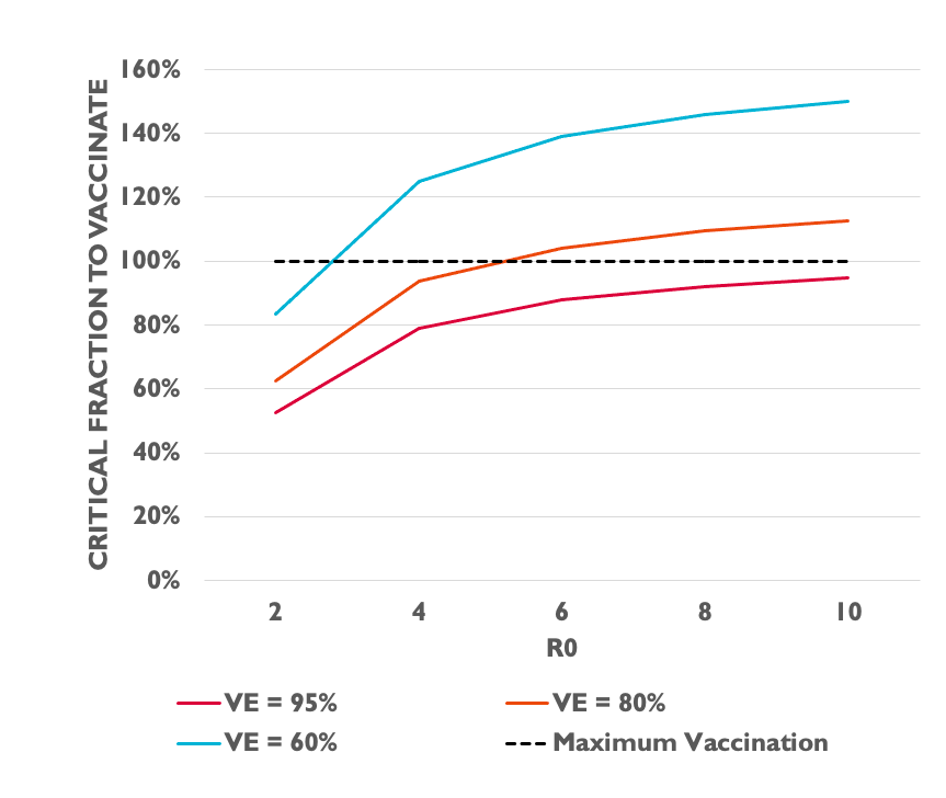 The dashed line is 100% vaccinated...we obviously can't vaccinate > 100% of the population. When we started out with R0 = 2 or 3 with OG SARS-2, herd immunity was readily attainable with VE of 70-90%.pic.twitter.com/s2jHj26sNl