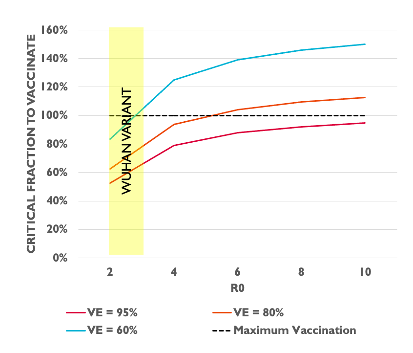 Variants do two things: they push R0 up, but they also appear to push VE down, at least for some vaccine/variant combinations. That makes herd immunity harder to attain. Here's alpha (B117), which has an R0 around 40% higher than OG sars-2.pic.twitter.com/NzlZsFvXuE