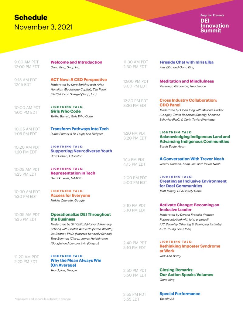 @Snap#DEIInnovationSummit including lively conversations with Idris Elba and Trevor Noah. https://twitter.com/Snap#ActionSpeakspic.twitter.com/bRpWCbGFWZ