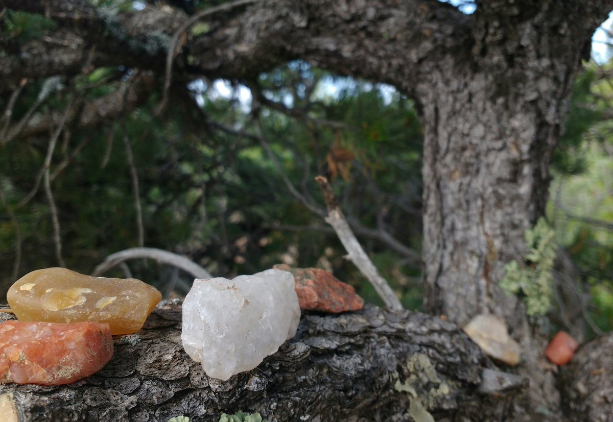 Informal land art. Pebbles balanced on piñon pine branches. New Mexico's geologic diversity honored by passing walkers. North of Santa Fe, in juniper-pine forests.pic.twitter.com/AYUcElYkd0