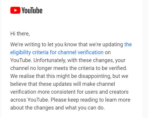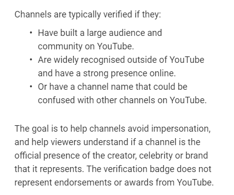 So @TeamYouTube no longer is allowing channels to be verified unless they have a large subscriber base and are well known outside of YouTuber, regardless of already existing status. This means all channels who have it and ain't big are getting it revoked. Seriously #YouTube ?pic.twitter.com/peRtpGWB6M