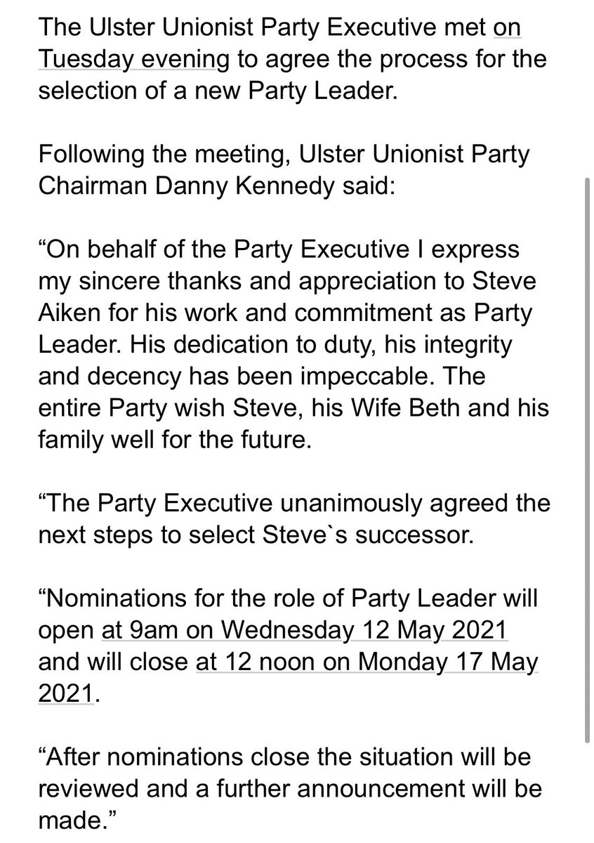 Nominations for the leadership of the Ulster Unionist party will open tomorrow at 9am and will close on 17 May. Once they’ve closed the party will discuss what the next steps will be in announcing the new leaderpic.twitter.com/hDHZIRA5lS