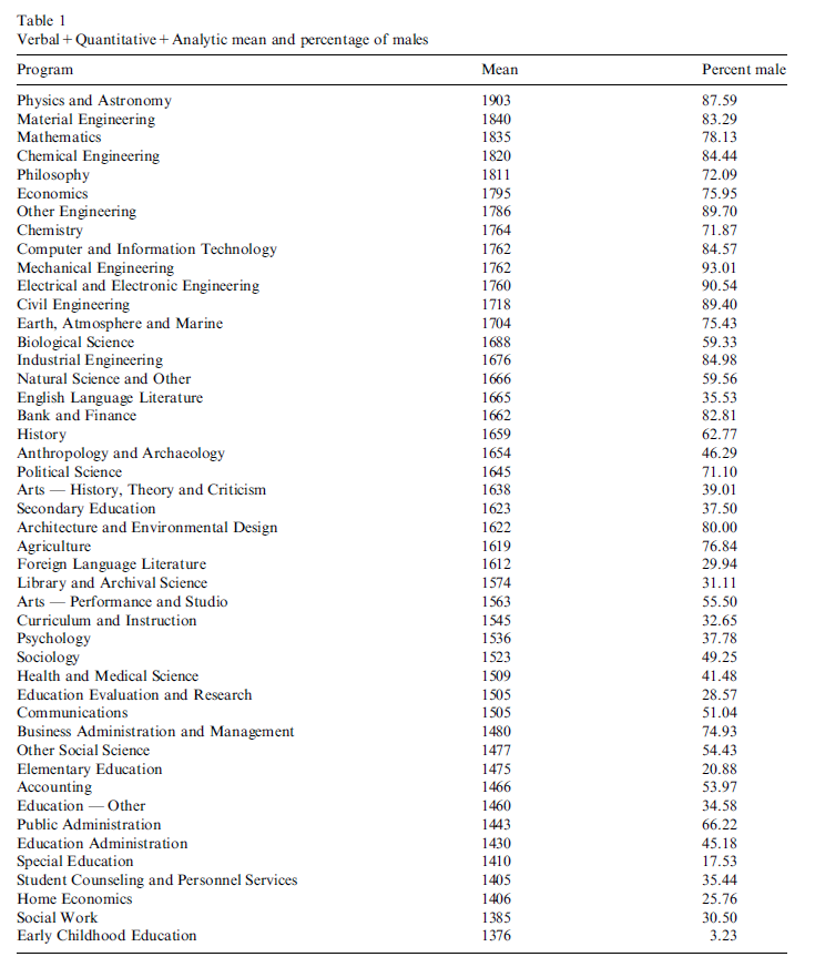 Average cognitive aptitude test (GRE) score results per academic field. Also cognitive tilts per field of Verbal (V), Spatial (S) and Mathematical (M) abilities. For example, engineers have math+spatial tilt. Sources: https://www.sciencedirect.com/science/article/pii/S0191886901000228 … https://journals.sagepub.com/doi/abs/10.3102/0034654316675476 …pic.twitter.com/MWbUqAwcF2