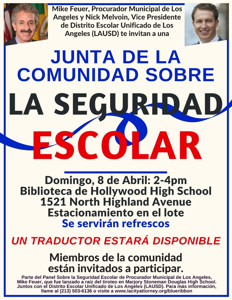 #SchoolSafety Community Meeting w/ City Atty Mike Feuer, LAUSD Board VP@nickmelvoin,@LASchoolPolice Chief Zipperman & an INCREDIBLE panel of experts is Sunday, April 8 at Hollywood High School. DETAILS