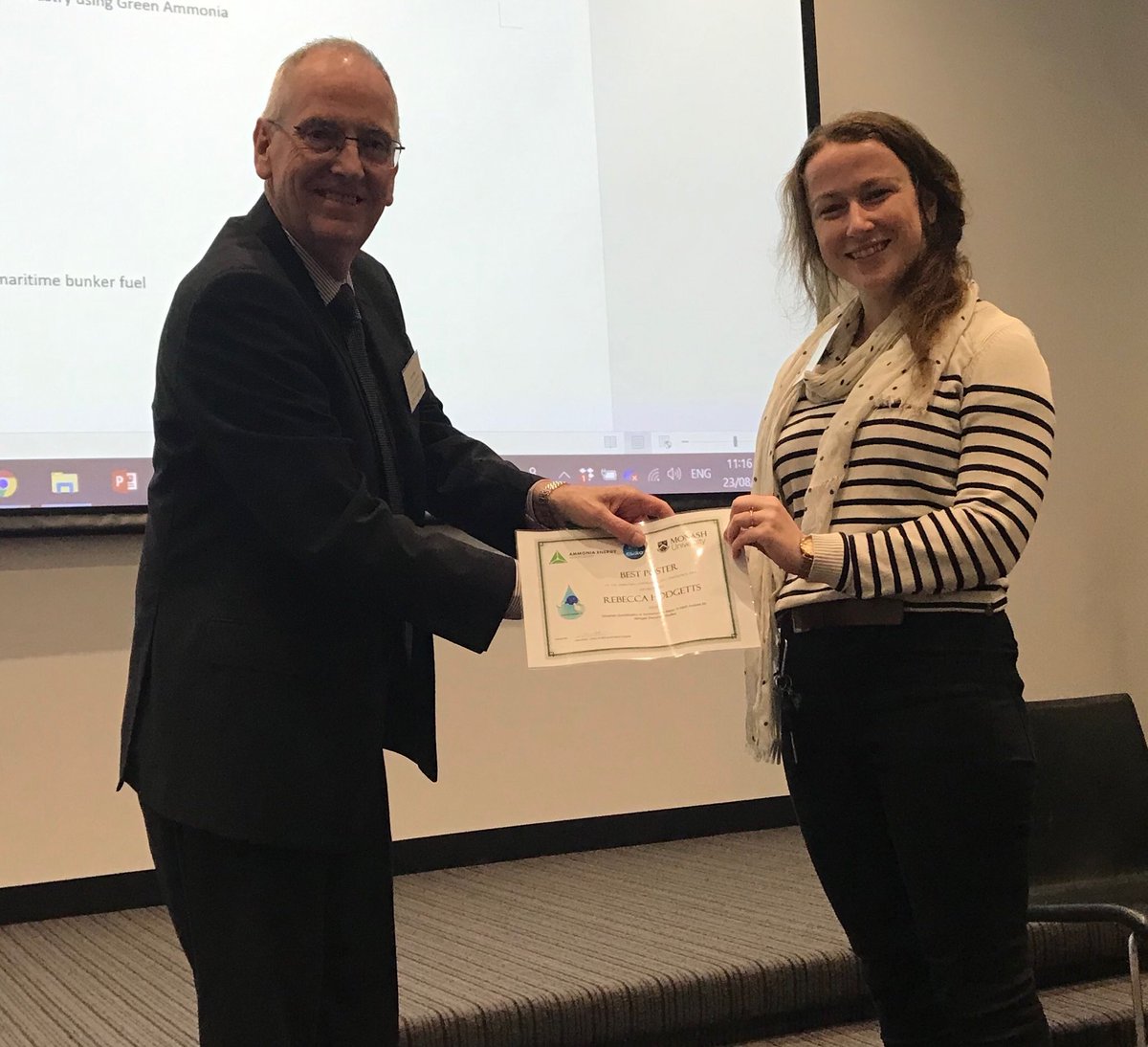 Bec Hodgetts winning the Best Poster Prize at the Ammonia Energy Association meeting today. Well done Bec!pic.twitter.com/pM6Jm53ocN