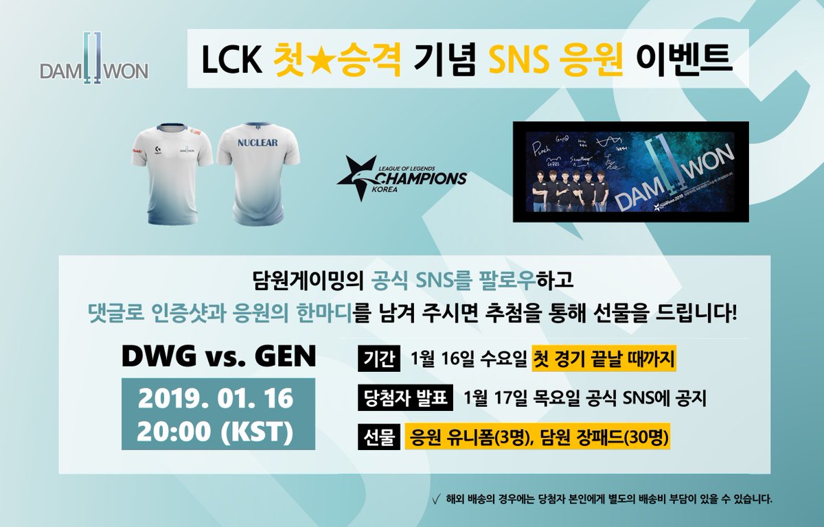 담원 공식 SNS(페이스북, 트위터, 인스타그램) 중 1개 이상 팔로우를 하신 후, 팔로우 인증샷 + 응원 댓글을 남겨 주시면 추첨을 통해 응원 유니폼과 담원 선수들의 사진이 담긴 장패드를 증정합니다