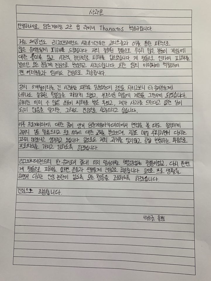 과거의 잘못은 다시 고치면 되는겁니다. 타나토스 선수 힘내세요~
