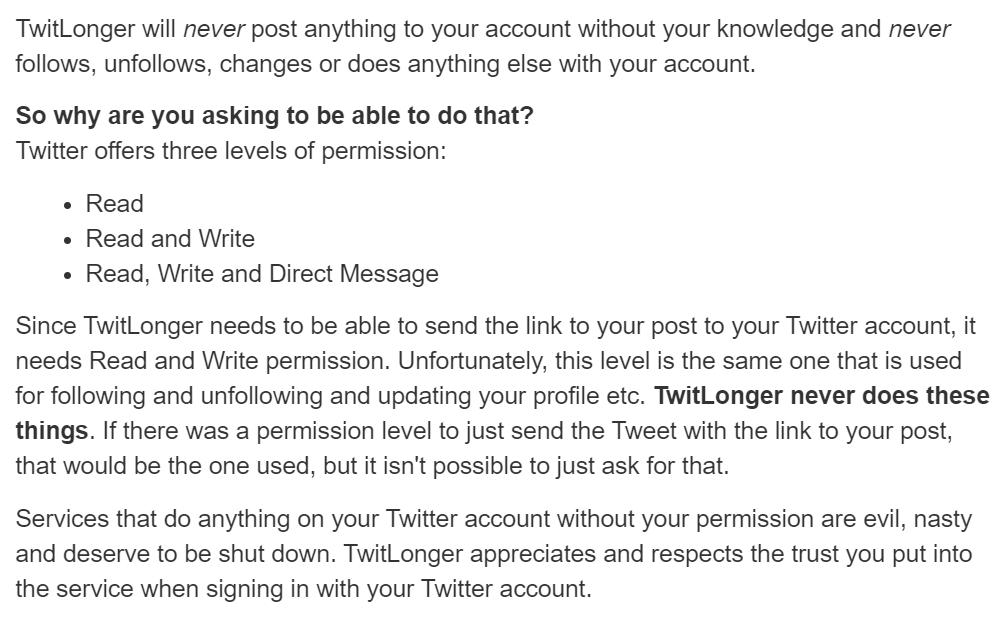 Reading further, Twitlonger may be safer than most other third party apps requiring access, but still exercise some caution and read through their processes:pic.twitter.com/F6D6JladPX