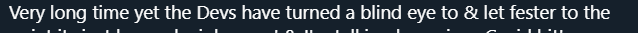 I never did say,there ain’t issues to see,only that insultin to the devs,ye don’t need to be. Do ye honestly think,they av their feet up all year,waitin to be told,how to fix their game here? Myself & others,still be enjoyin the game,but if ye can’t see why,that’s the real shame.