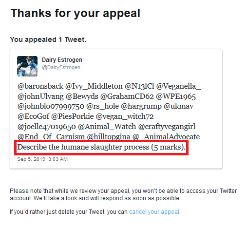 Just got out of Twitter Detention. A farmer saw the phrase "humane slaughter" and reported it as violent content