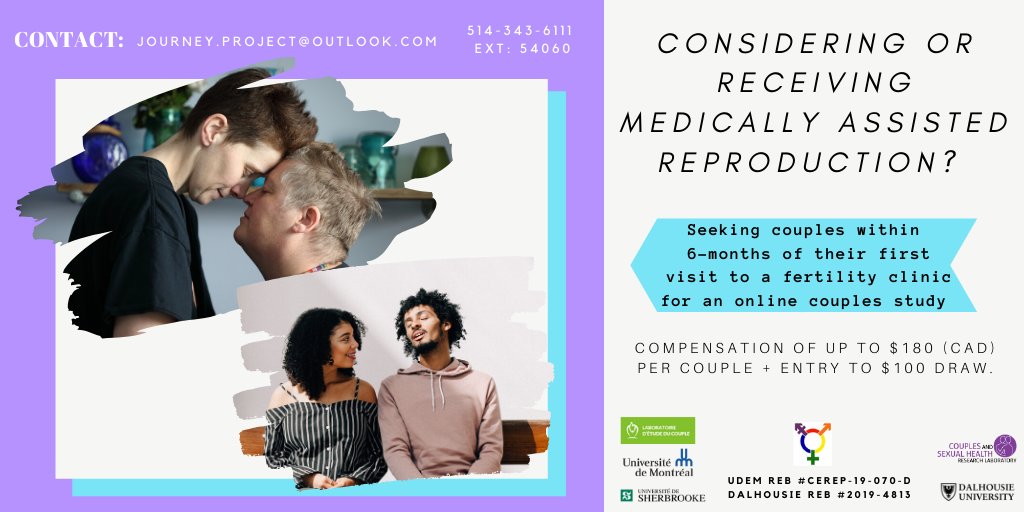 #couples#study! We are seeking couples who are considering/receiving#fertility treatment or medically assisted#reproduction to complete a series of online surveys. Contact us at journey.project@outlook.com or 514-343-6111 ext. 54060 to participate! Please RT!pic.twitter.com/N0VOlDIcVF