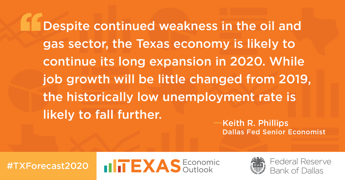 WATCH LIVE: Economist Keith R. Phillips delivers his Texas Economic Outlook for 2020 Friday, Jan. 31 at 12:15 p.m. CT. He'll discuss the factors likely to influence Texas in 2020 and the challenges facing regions and industries in the state.https://www.dallasfed.org/research/events/2020/20econforecast.aspx …