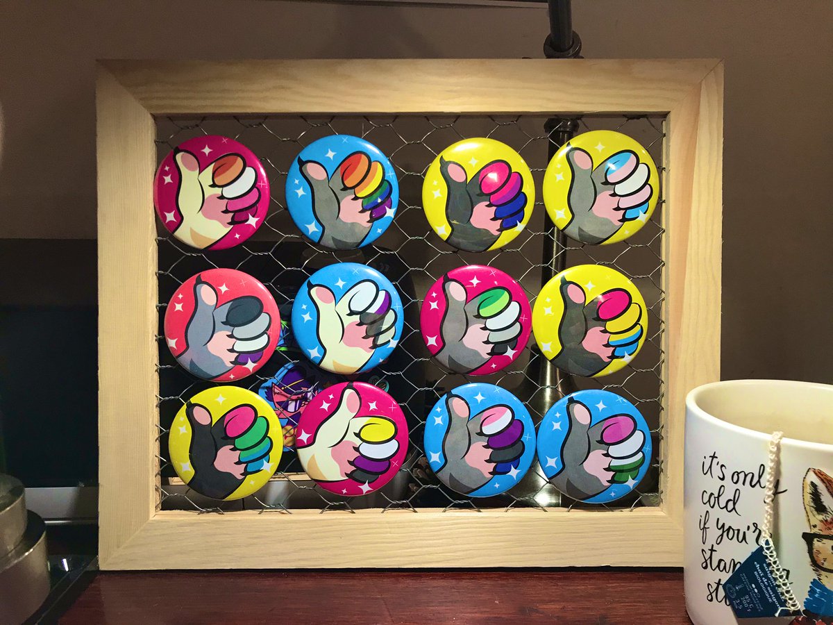 After the bunny emergency and a visit from my mom I fell behind getting set up to display my stuff here in town. Pressed up a storm today! Here’s a collection of my pride paw buttons. Any flags missing that I can add in the future?pic.twitter.com/mW2AzbmKcs