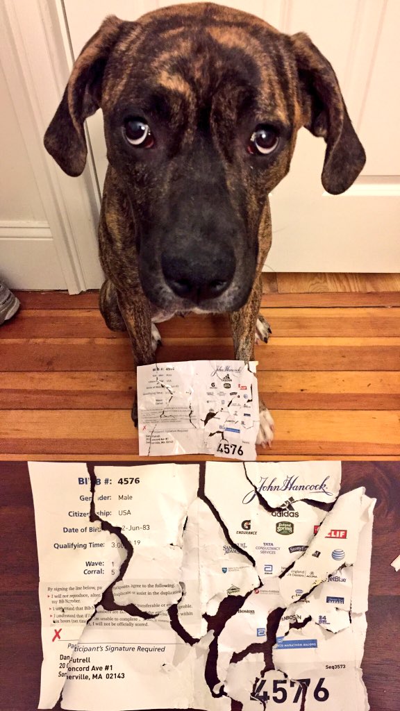 @bostonmarathon, my puppy ate my runner's packet. I think I'm supposed to sign this thing for you. Advice?pic.twitter.com/6F6Ed8BCpl