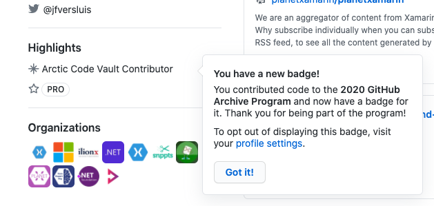 was about to ask how does one achieve this... but alas I seem to have the same badge now... so I can only guess the answer... contribute to OSS projects instead of simply consuming them...https://twitter.com/jfversluis/status/1283808903348793346 …