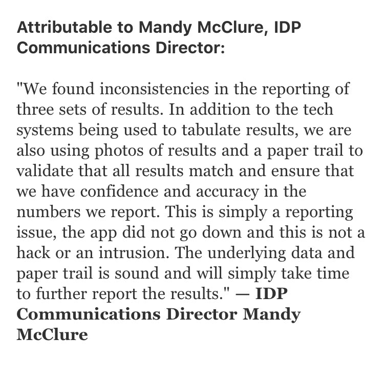 “We have experienced a delay in the results because we don’t like the results and are working to change them.”https://twitter.com/fivethirtyeight/status/1224541776868007937 …