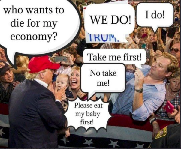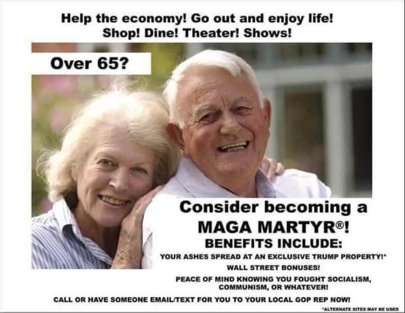Here is a novel idea. Those with diabetes, heart condition, high blood pressure, obesity stay the F- home and self quarantine. When did the needs of the .05 now going down even more, out weigh the needs of the many