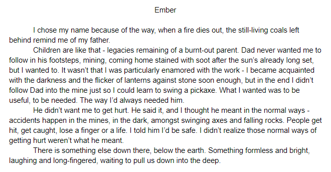 #LGBTWIP I didn't know where to cut this and I don't put peeks at my writing up on twitter very often and I'm very nervous about it but anyway here's a bunch of opening lines from my main character, whose name is Ember, because I am a predictable fire-obsessed gremlinpic.twitter.com/hUGs4lY0mo
