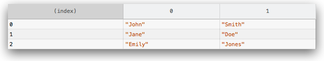 For example, you can try this in browser console: var data=[ {firstName:"John",lastName:"Doe",age:40}, {firstName:"Gerald",lastName:"Jewett",age:30}, {firstName:"Sam",lastName:"Fling",age:35}, {firstName:"Royce",lastName:"Keep",age:32} ]; console.table( data )