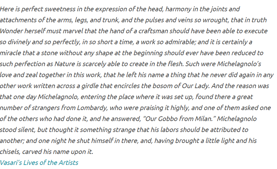 Reminded me of a humorous story surrounding Michelangelo's only signed work, Pietà. TL;DR: After overhearing bystanders admire it, thinking the creator was from Milan, he angrily snuck into where it was set up & chiseled his name along Mary's torso. Removing all doubt.pic.twitter.com/9HhvUw1W28
