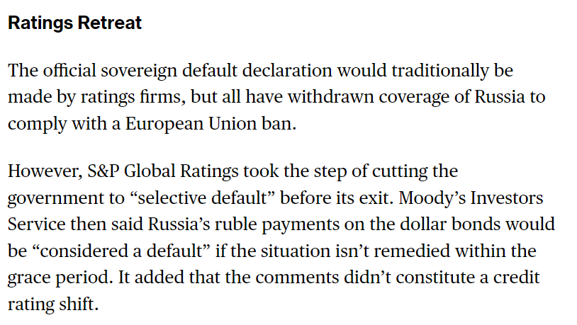 This is a wrinkle I did not expect: The ratings agencies that would typically declare a default in this situation aren't covering Russia because of an EU ban.pic.twitter.com/QYcwv8lliQ
