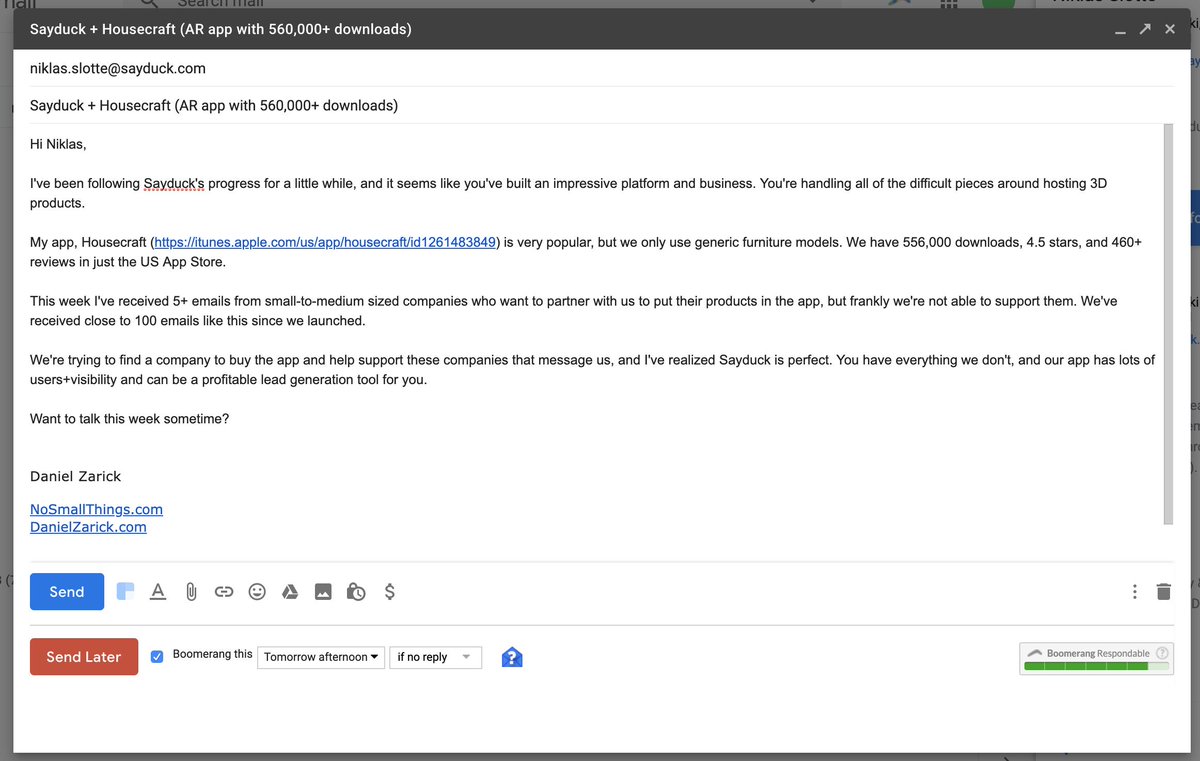 This might be interesting for folks & embarrassing for me...😳 I send 2-10 of these emails every week & follow up a few times to the ones that seem most promising. Some become calls to discuss details. Currently have ~5 in different stages. Just need 1 to land. /cc @jtaby pic.twitter.com/vIPnER1imo