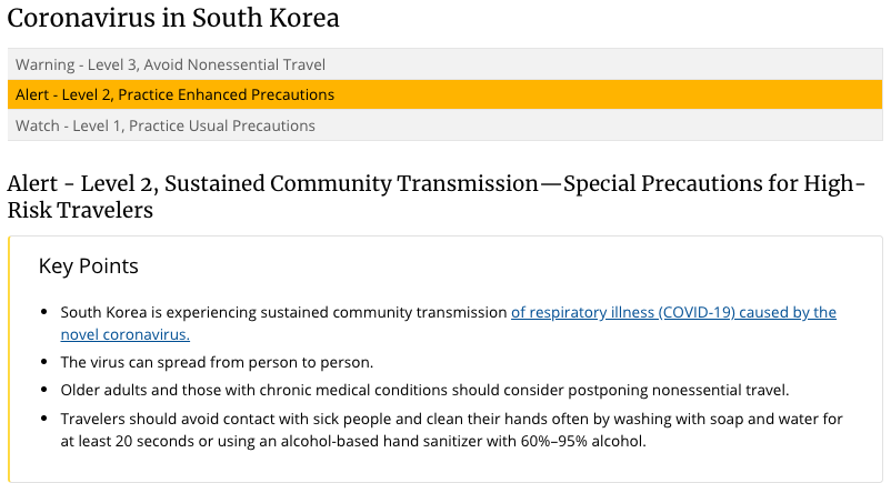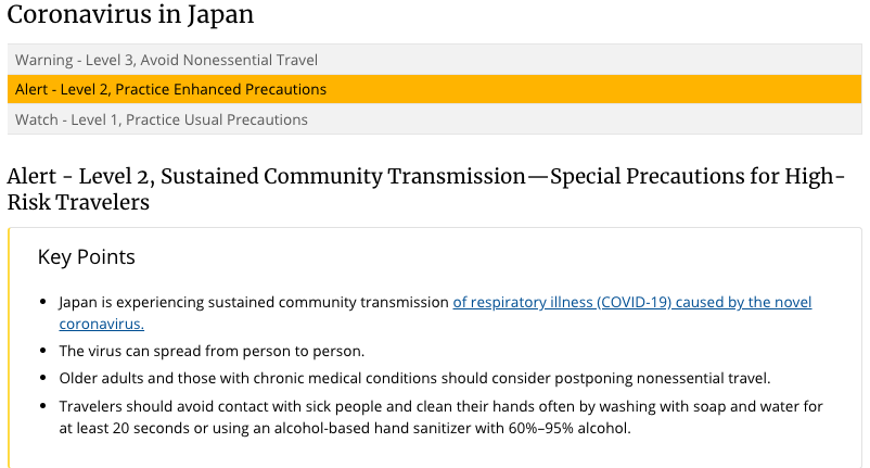 1. @CDCgov has upped its warnings about travel related to the #COVID19. First, Japan: On Feb 19 , CDC issued a Level 1 alert. Level 1 means: Be careful/be aware. It's now Level 2. "Older adults & those with chronic med conditions should consider postponing nonessential travel"pic.twitter.com/evEo4h2CYc