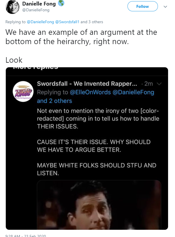 You can use a triangle or whatever in a standard, organized debate. But ultimately, racism isn't rational or logical. This triangle doesn't do what you think it does; it merely polices black people and elevates people who stick to the tone of the diagram