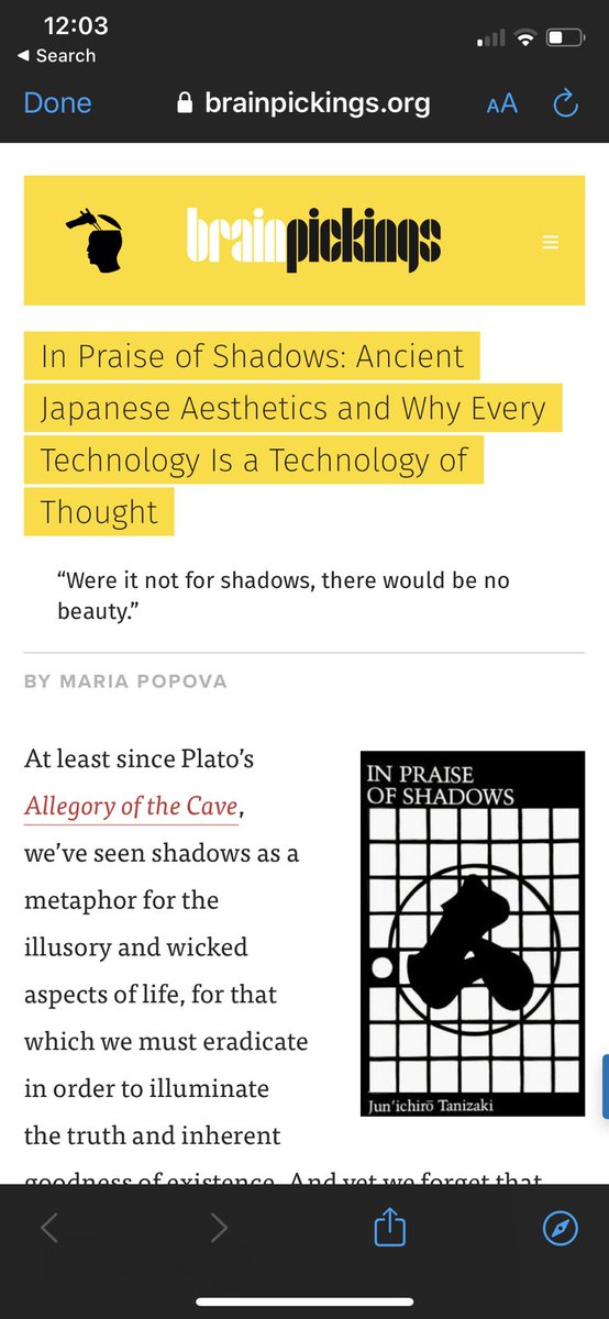 If you haven’t seen it already, check out the essay “In Praise of Shadows” which talks about importance of shadows in traditional Japanese aesthetics. Very interesting stuff, gonna think about interior aesthetics a lot when I’m inside all the time...https://www.brainpickings.org/2015/05/28/in-praise-of-shadows-tanizaki/ …