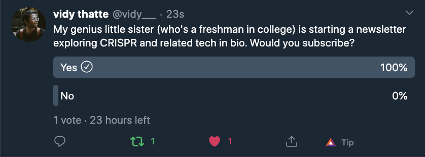 My genius little sister (who's a freshman in college) is starting a newsletter exploring CRISPR and related tech in bio. Would you subscribe?