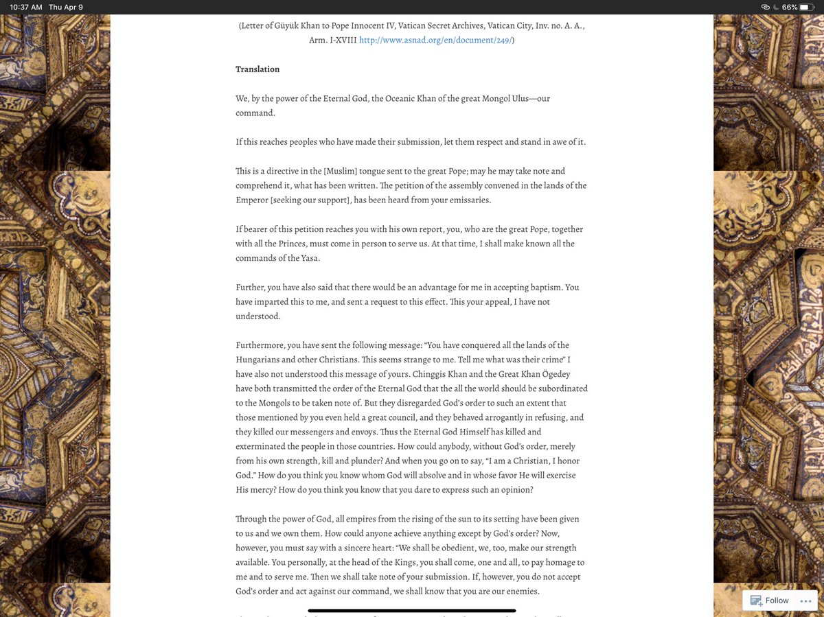 https://ballandalus.wordpress.com/2015/06/01/mongol-papal-encounter-letter-exchange-between-pope-innocent-iv-and-guyuk-khan-in-1245-1246/ … from the letters between the pope and the great guyuk khan https://twitter.com/eigenrobot/status/1248180418647453696 …pic.twitter.com/1BZBrQDl1A