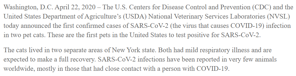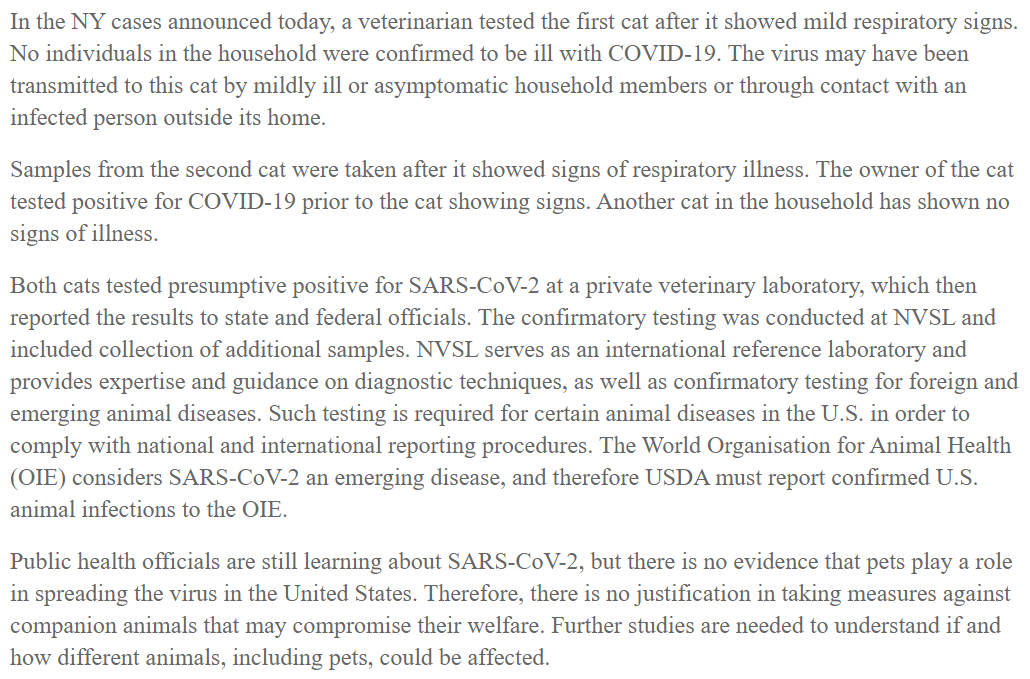 Confirmation of #COVID19 in two pet cats in #NewYork "At this time, routine testing of animals is not recommended." - @USDA pic.twitter.com/SC395G9F1Y