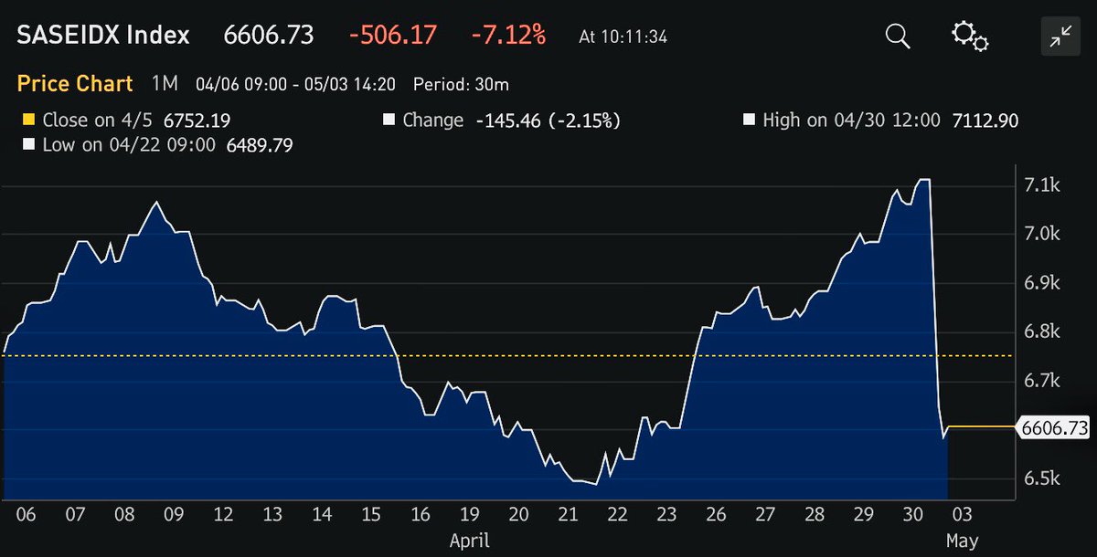 OUCH! Saudi stocks slump >7% after rating outlook cut by Moody’s and as Minister warns of ‘Painful’ measures ahead https://www.bloomberg.com/news/articles/2020-05-03/saudi-stocks-slump-as-minister-warns-of-painful-measures-ahead … pic.twitter.com/bjrSjqT1hS
