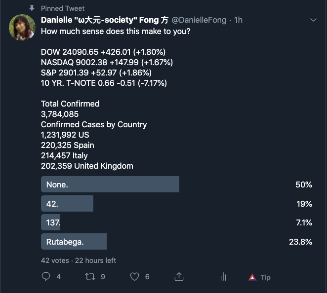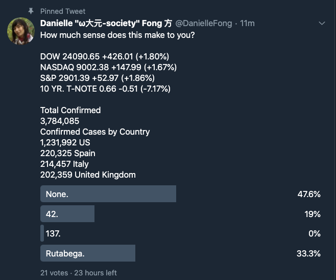 I just calculated confirmed case doubling time since first case on Nov 17, 2019. It's 8 days.https://surfingtheuniverse.com/2020/05/08/20200507h-day-128-about-8-day-average-confirmed-covid-19-case-doubling-time-since-first-case-nov-17-2019/ …