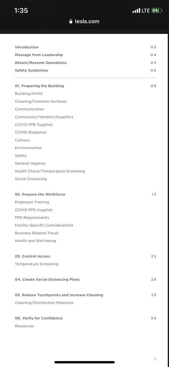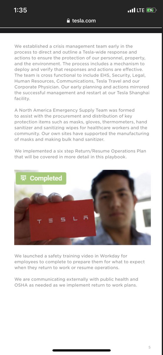 Tesla’s Reopening Plan is a model document for businesses and states and crucial institutions looking to reopen safely. There are always improvements possible, but in lieu of clearer leadership from the federal government, I can recommend this! @Tesla 👍🏻 https://www.tesla.com/sites/default/files/blog_attachments/Tesla-Return-to-Work-Playbook.pdf?redirect=no … pic.twitter.com/0oV35RaVVo