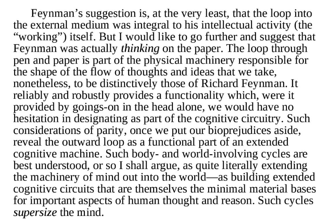 More on the point (from Andy Clark — not sure Feynman would be onboard). Feynman was likely after something different, as he is frequently at pains to correct the notion that he was doing something private, special, inaccessible to mere mortals etc.pic.twitter.com/MleiLNFQBn