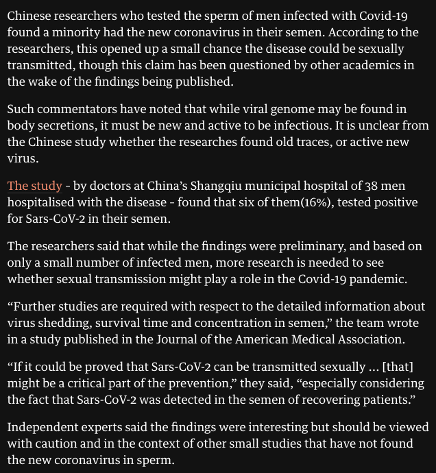 The Guardian: Researchers at Chinese Shangqiu Municipal Hospital found that 16% of 38 men hospitalised with the Covid19 disease tested positive for coronavirus in their semen Dudes, protect your balls! Wear masks & condoms and socially distance! We don't want a man shortage! 🙏pic.twitter.com/Ny68Pg8ulC