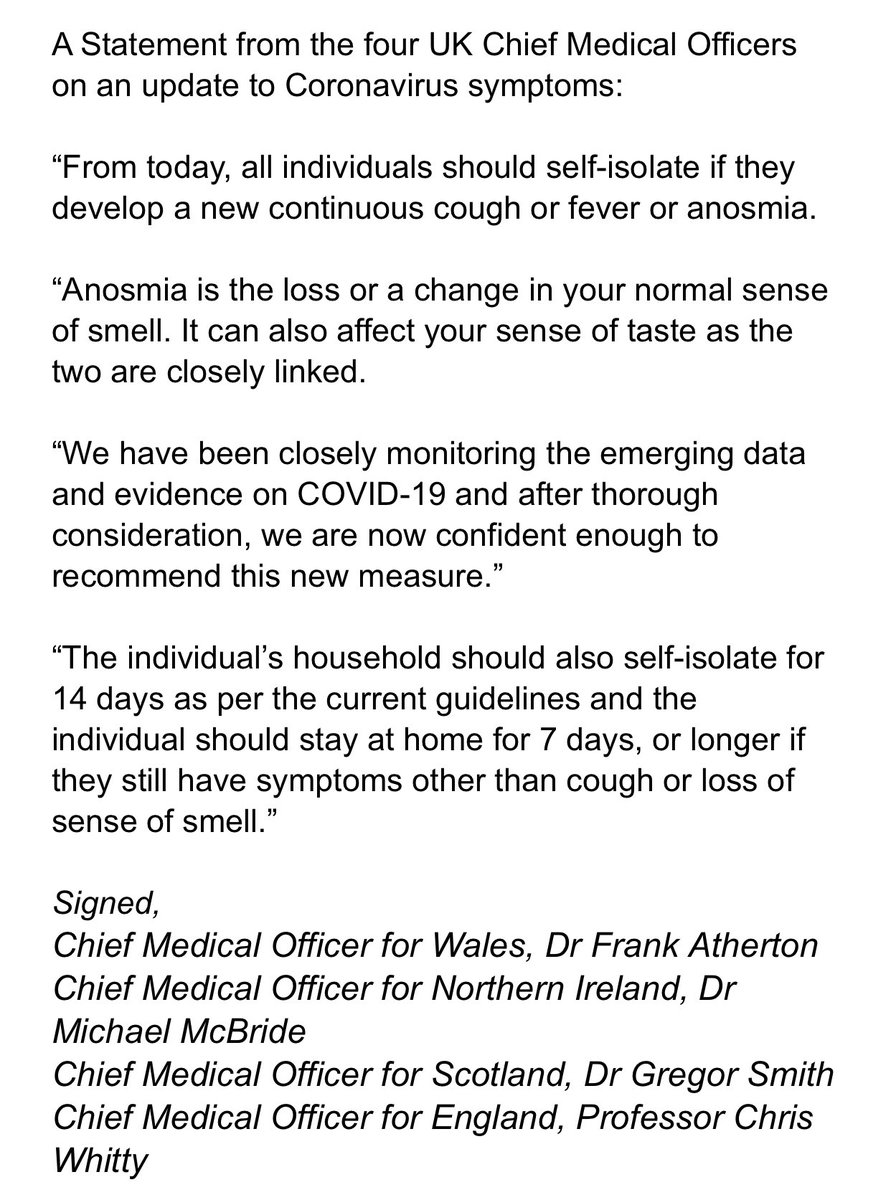 You should now self isolate with your whole household if you experience a fever, continuous cough OR a loss of smell or taste. @LBC